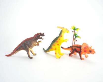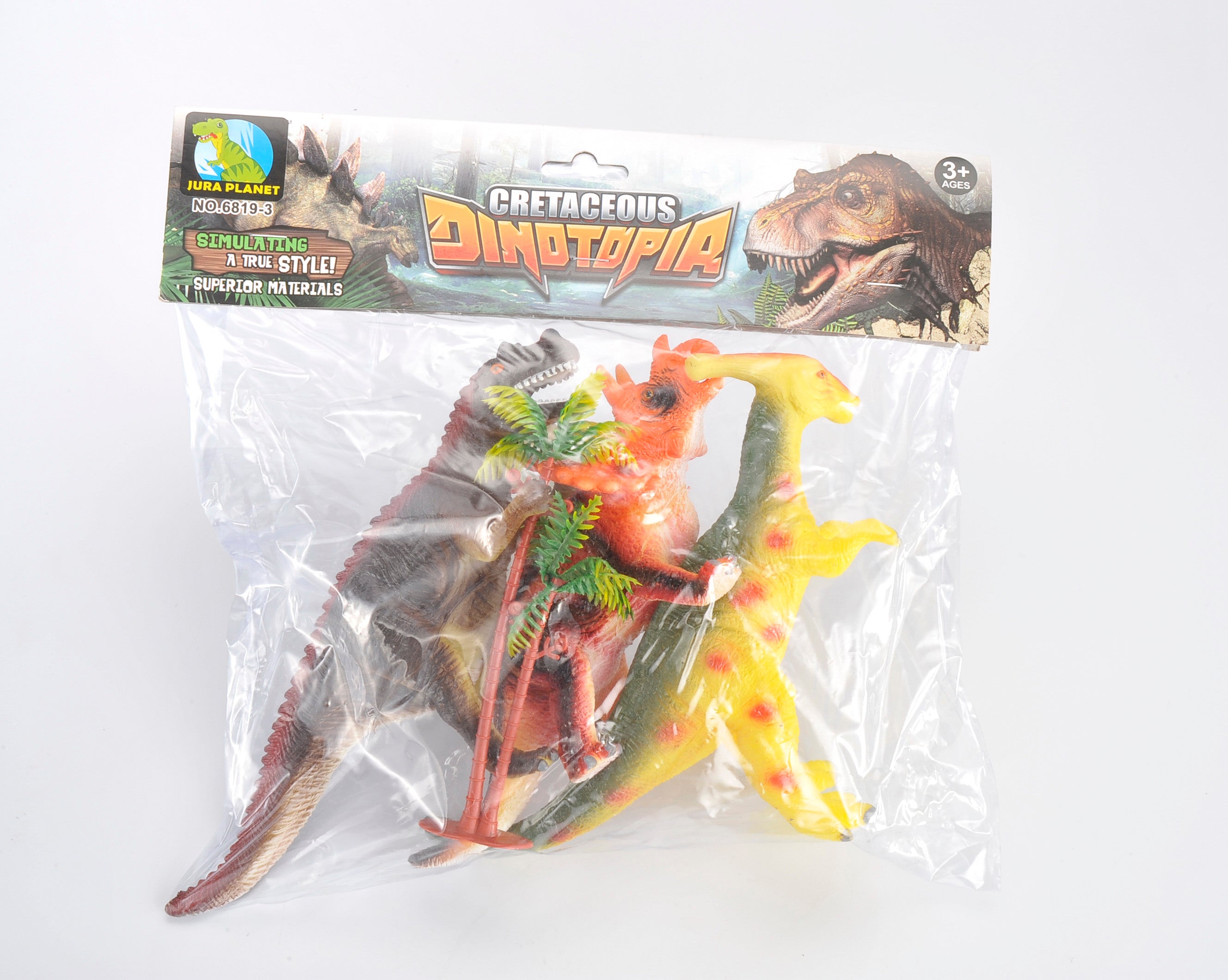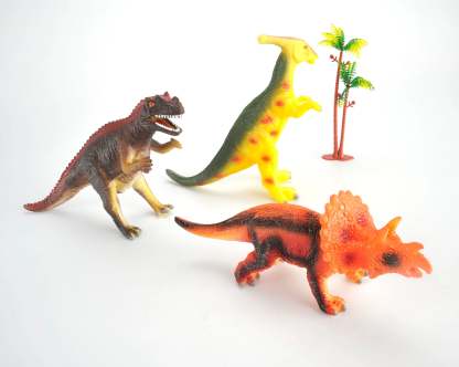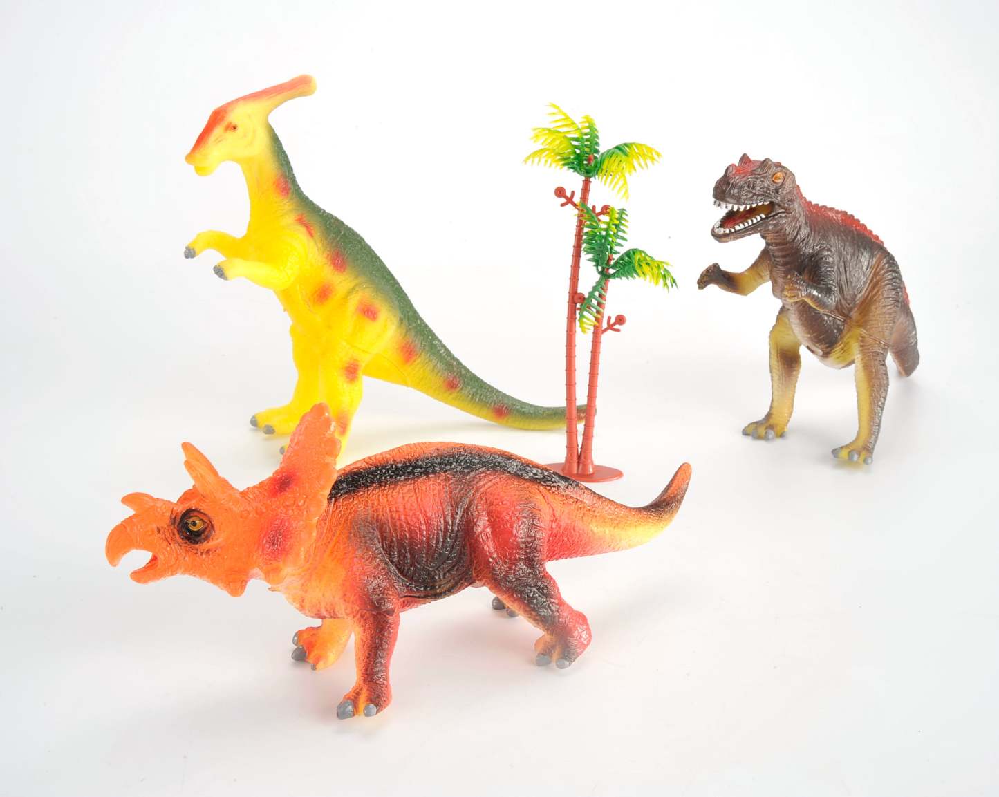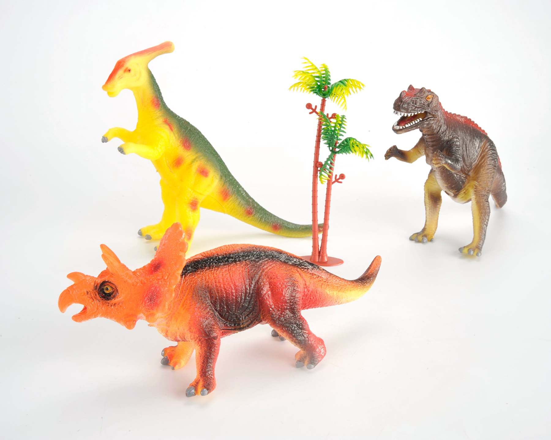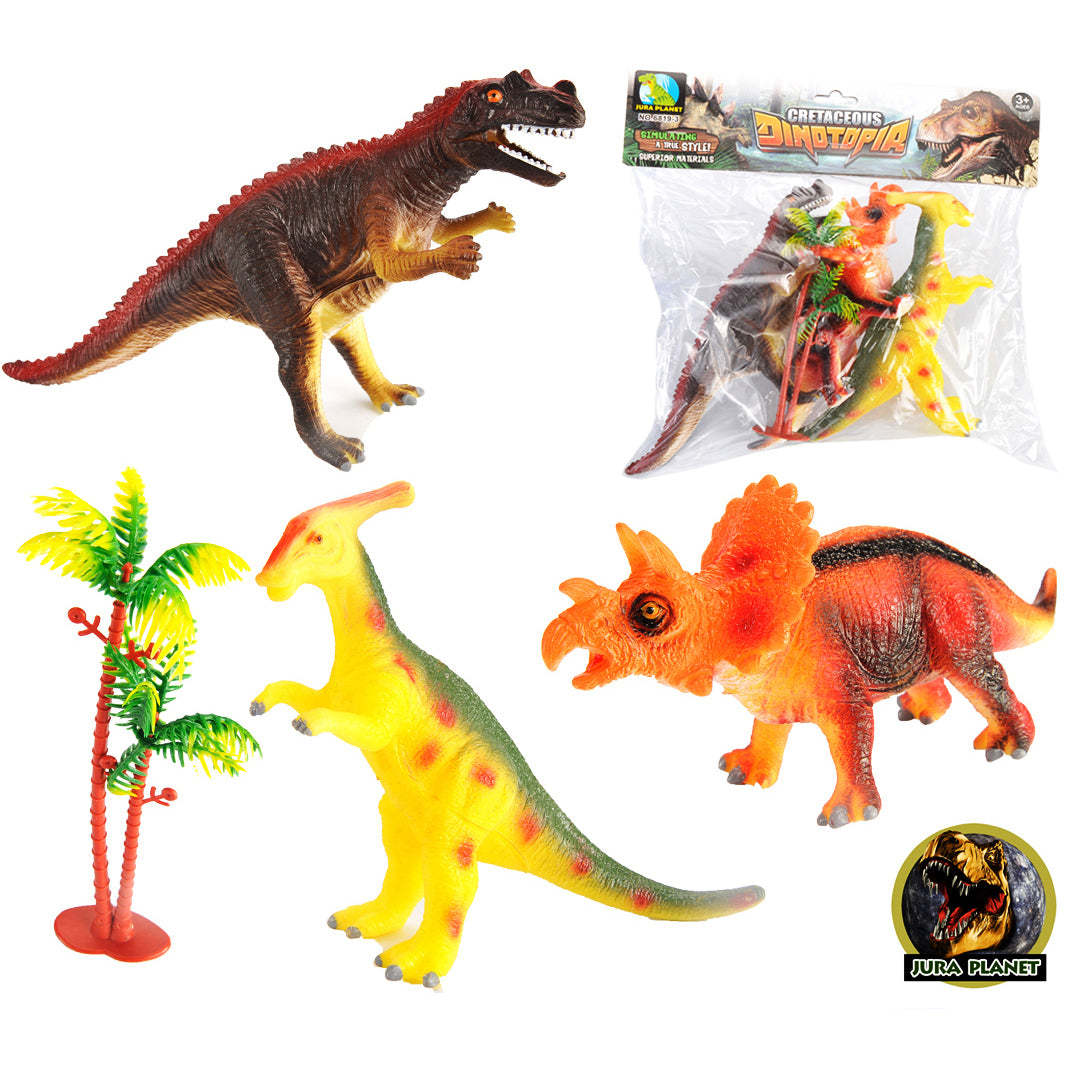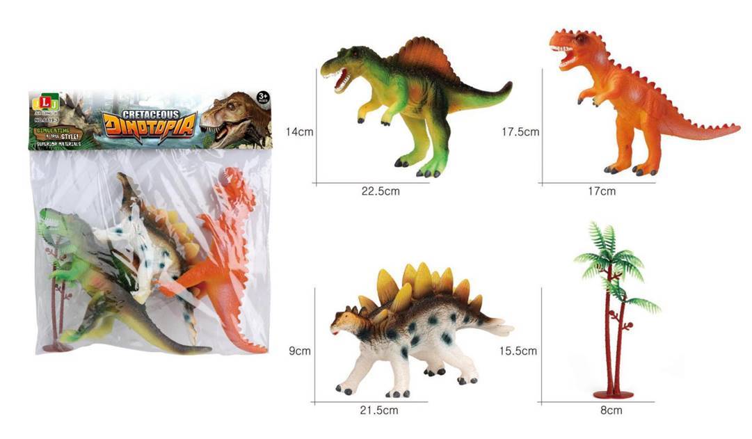 • Simulation, a true style, superior materials. 4 in 1 pack: Three different dinosaurs and a plants/tree. Dinosaur 1: H-14cm. W-22.5cm.