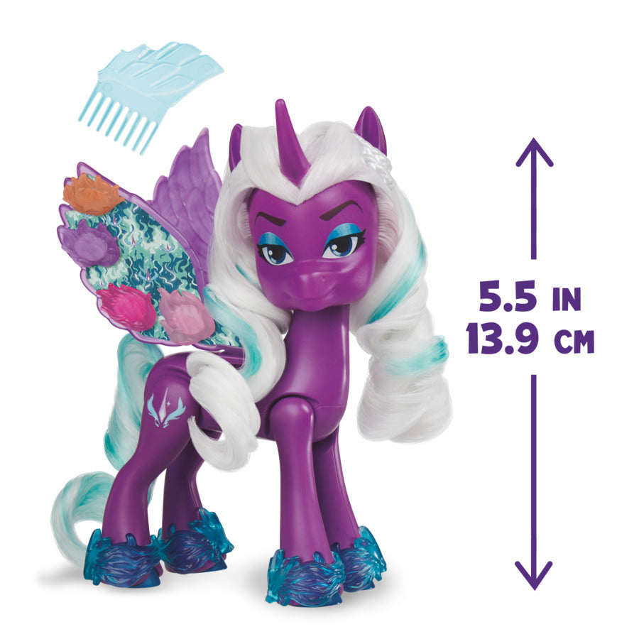 Connect the colorful charms to Opaline's beautiful wings to imagine she's growing her Fire Alicorn magic! Then, squeeze the figure's back legs to make her wings flap up and down. Comes with 10 accessories for styling and storytelling. Customize her look with 4 show-inspired gauntlet bracelets that connect to her legs. This My Little Pony doll is a 5-inch purple Alicorn figure with an Alicorn Cutie Mark on one side. Figure has soft, long white hair and a comb for styling fun!