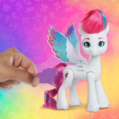 Discover magical secrets with My Little Pony Wing Surprise Zipp Storm toy! Zipp is a rebellious princess who loves investigating mysteries in the My Little Pony: Make Your Mark show. Squeeze the figure's back legs to make her wings flap and reveal surprise colors on one side. Then, hold the magnifying glass decoder accessory over Zipp's wings to discover hidden Cutie Mark designs! Comes with 10 character-inspired accessories for storytelling.