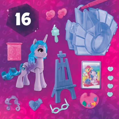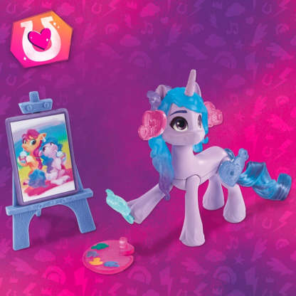 - CUTIE MARK MAGIC WITH IZZY: 3-inch pony is purple with blue hair, inspired by the My Little Pony: Make Your Mark show. Comes with plug-in heart button, Cutie Mark charm, and hair accessories!