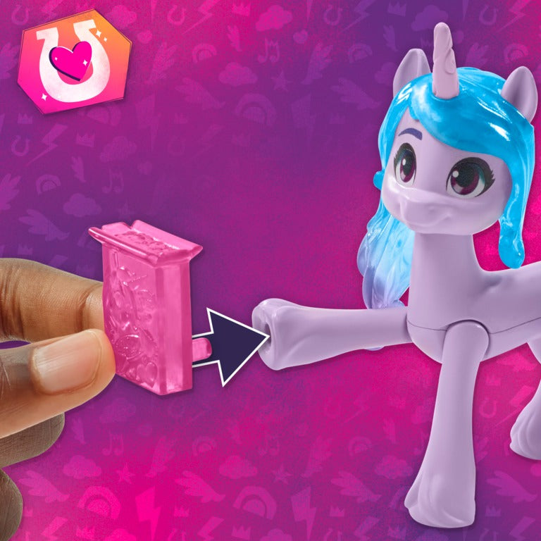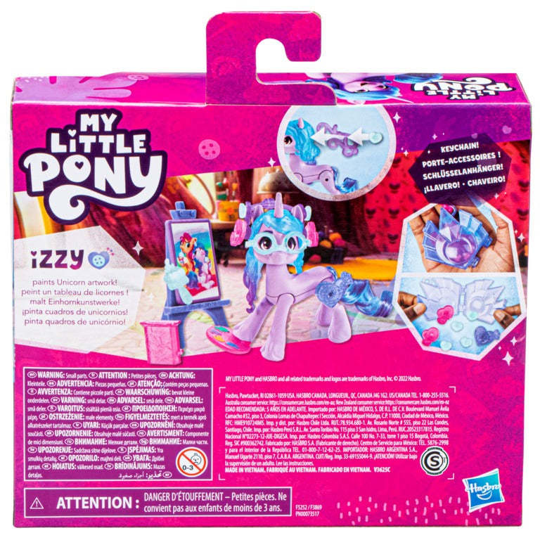 Includes a poseable 3-inch Izzy Moonbow pony figure with a plastic mane and soft tail. Figure has a heart-shaped button with a Cutie Mark on one side, and a plug-in Cutie Mark charm on the other side. Reveal surprise story and style accessories, like charms for decorating her hair, and Hoof to Heart accessories she can hold in her hoof! Store them in the keychain for on-the-go fun.