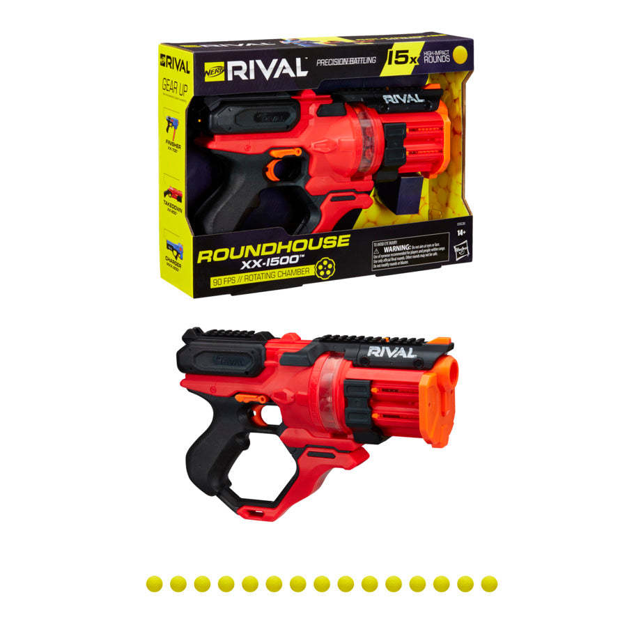 Smash into intense action with Nerf Rival Roundhouse XX-1500 blaster! It features a clear chamber that holds 6 rounds -- prime the blaster and the chamber rotates, aligning around into firing position and reloading another round into the chamber.