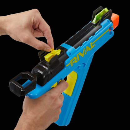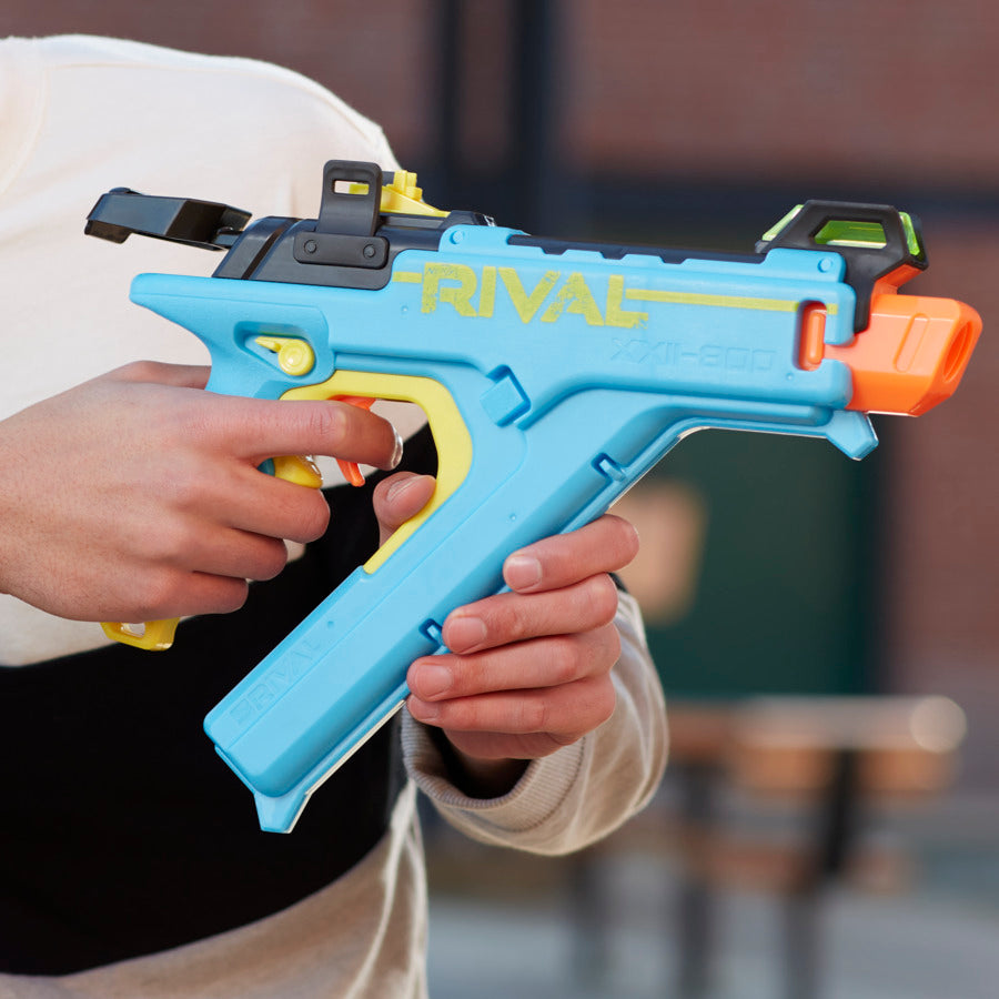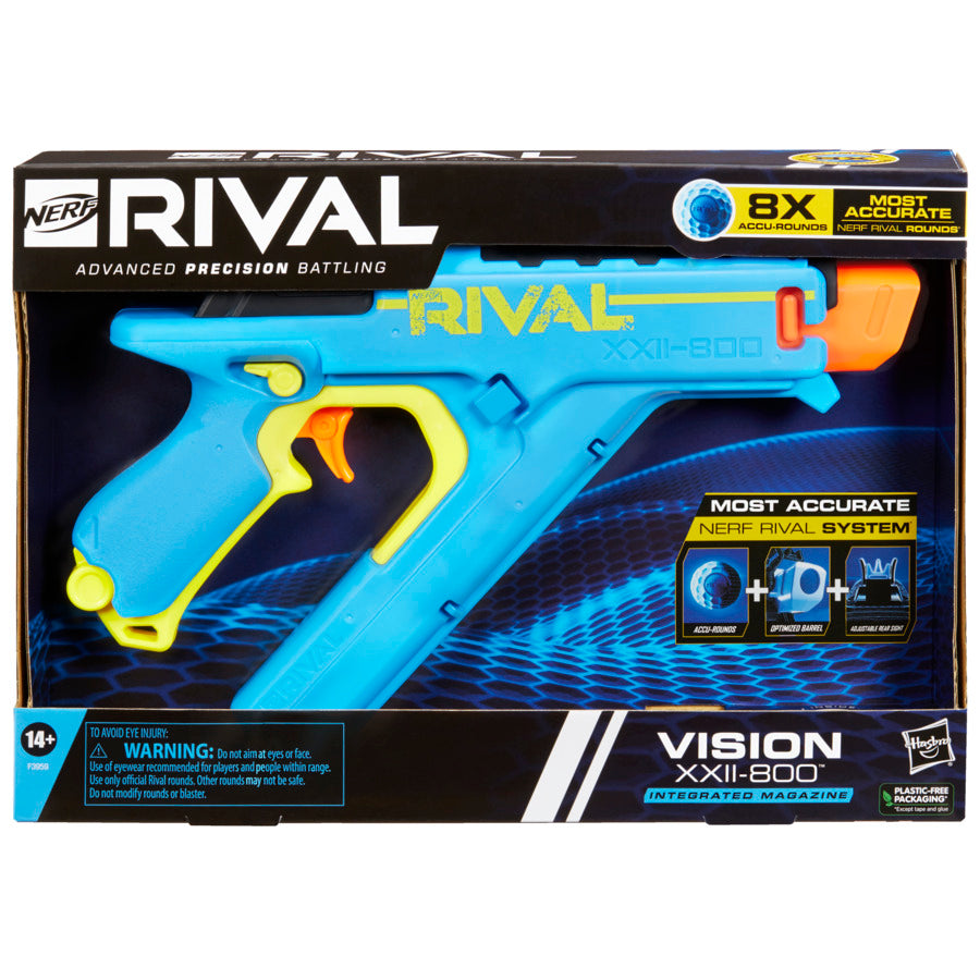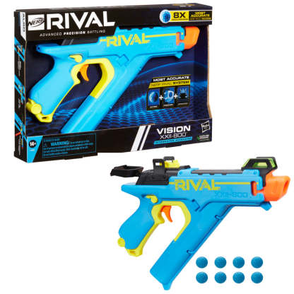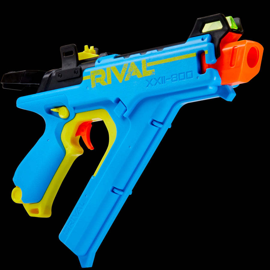 NERF RIVAL VISION XXII-800 BLASTER: With an 8-round integrated magazine, draw-back priming bar, and trigger lock. Fires rounds at a velocity of 90 feet per second.