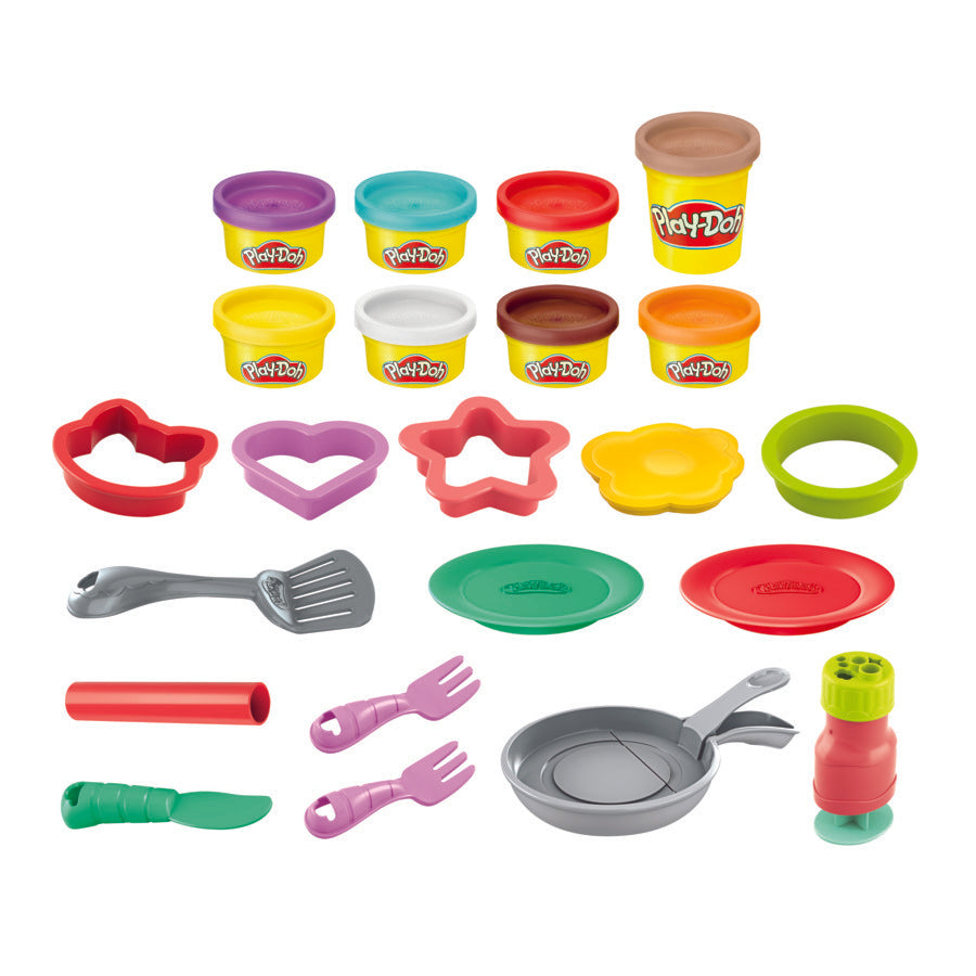 + 14 TOTAL PLAY-DOH TOOLS: The roller and cutters flatten and shape pretend pancakes while spatula, syrup extruder, egg stamper, 2 plates and 2 forks complete the chef pretend play experience